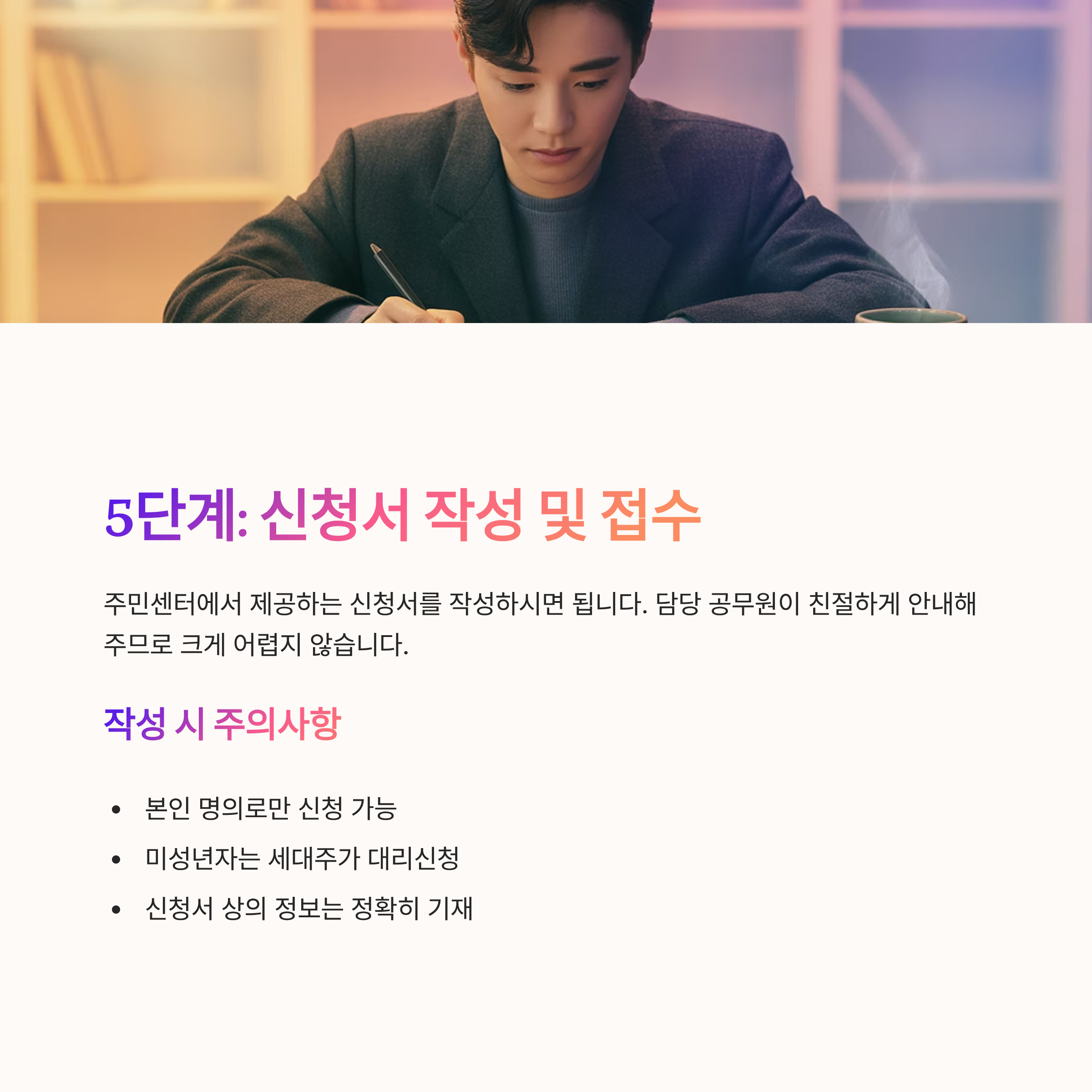 주민센터에서 제공하는 신청서를 작성하시면 됩니다. 담당 공무원이 친절하게 안내해주므로 크게 어렵지 않습니다.