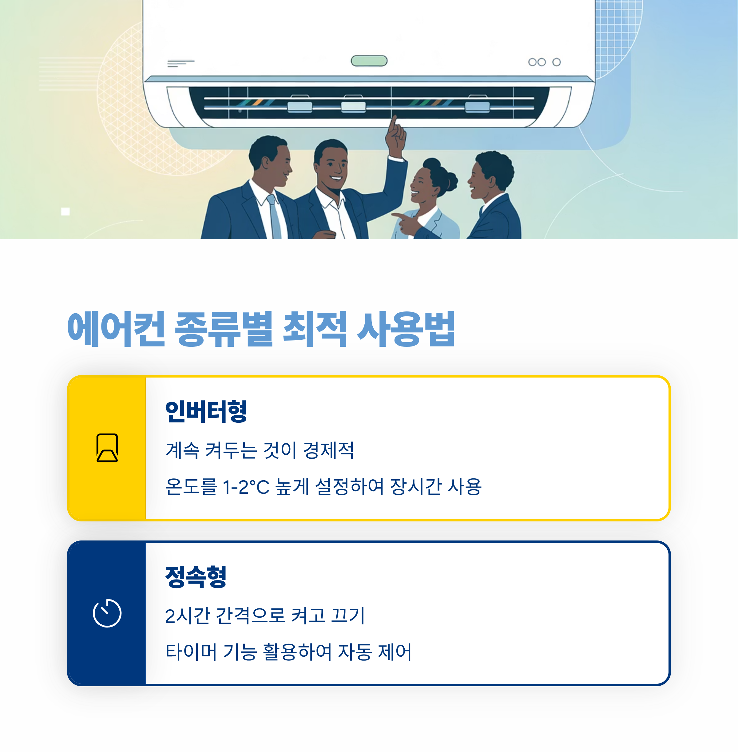- 에어컨 종류별 최적 사용법 적용 - 인버터형은 계속 켜두고, 정속형은 간헐적 사용