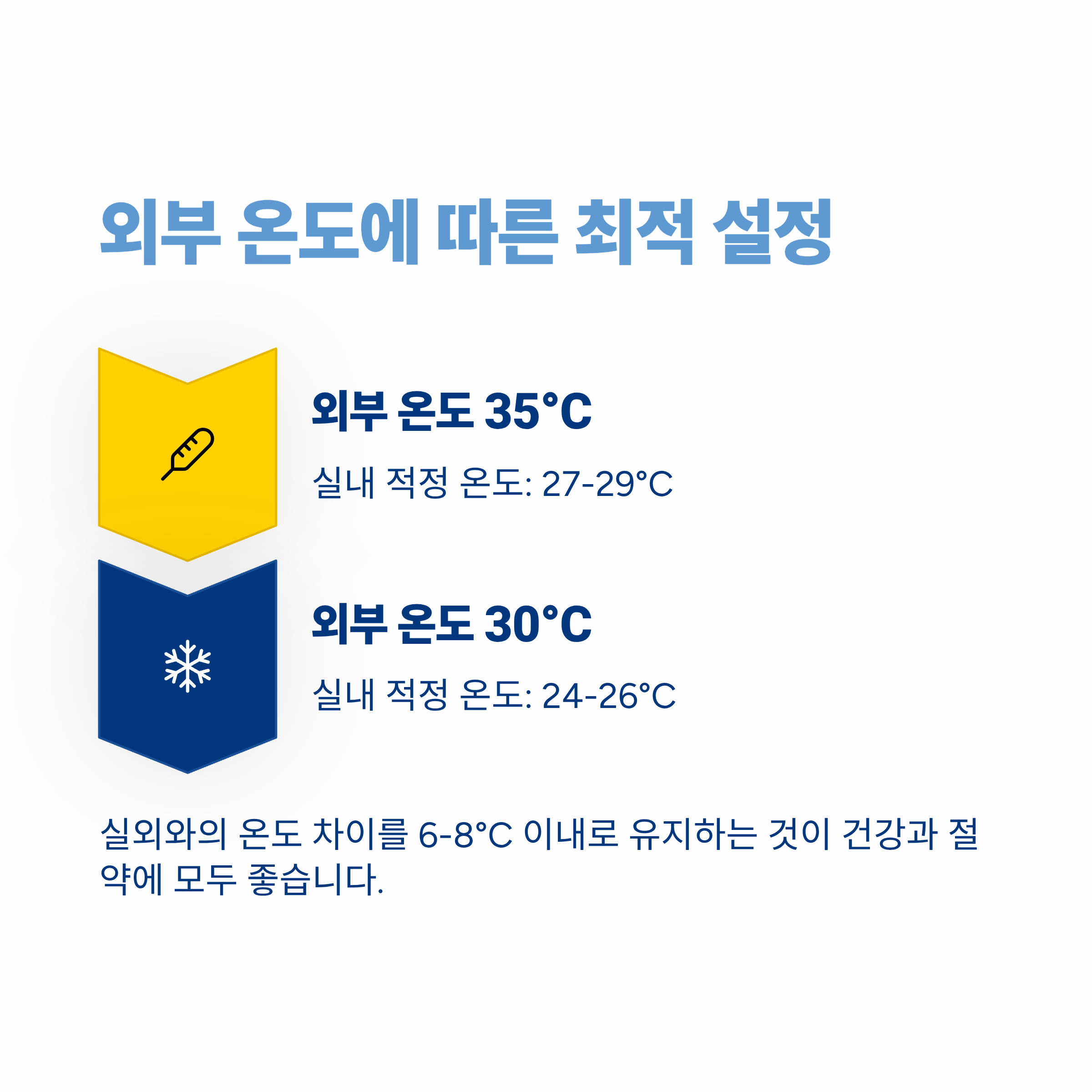 여름철 실내 적정 온도는 24-26도 사이입니다. 실외와의 온도 차가 6-8도를 넘지 않도록 유지하는 것이 중요한데요, 만약 외부 온도가 35도라면 내부 온도는 27-29도를 권장합니다