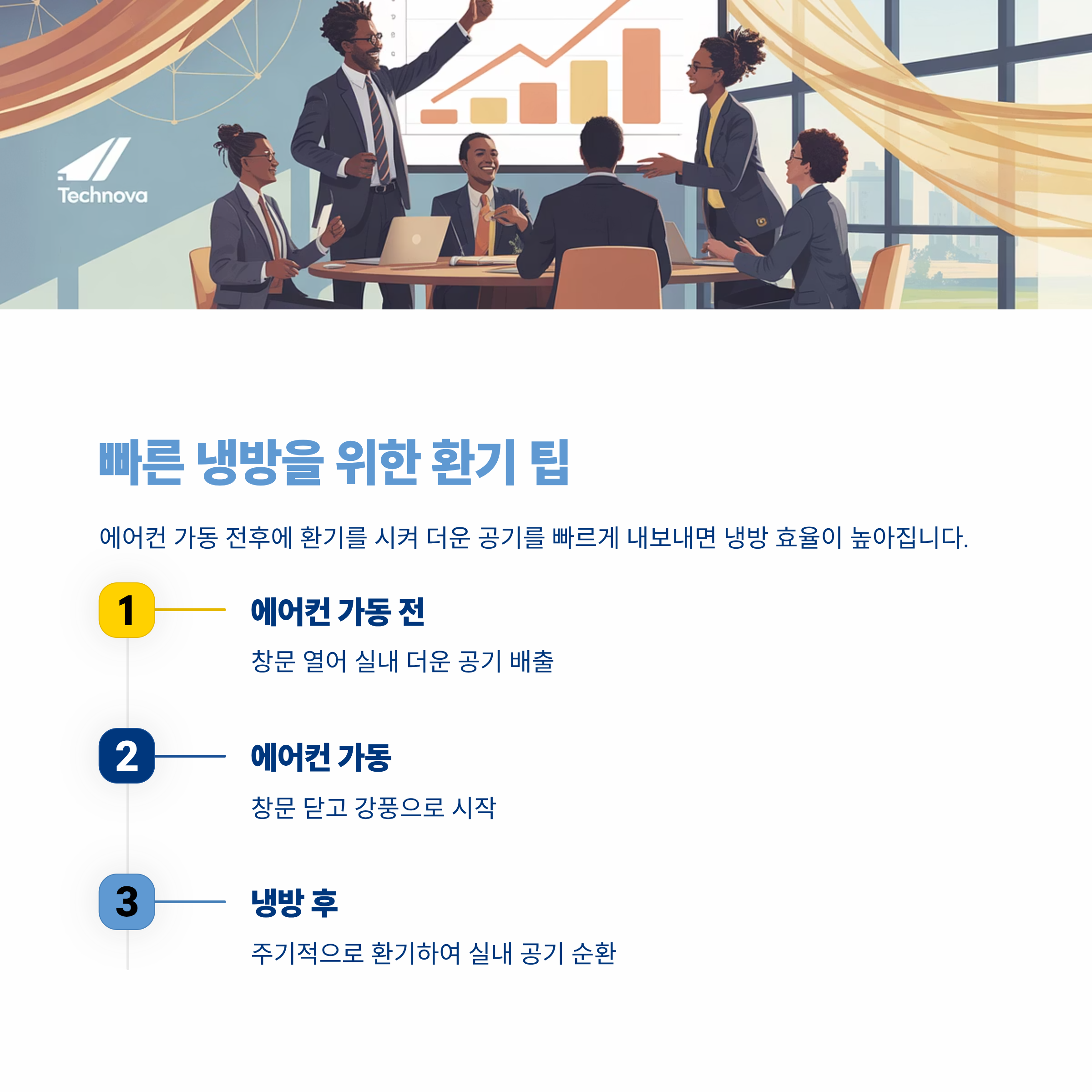 에어컨을 켜고 실내 온도를 빠르게 낮추고 싶다면, 에어컨 가동 전후에 환기를 시켜서 더운 공기를 빠르게 내보내는 것도 좋은 방법입니다.