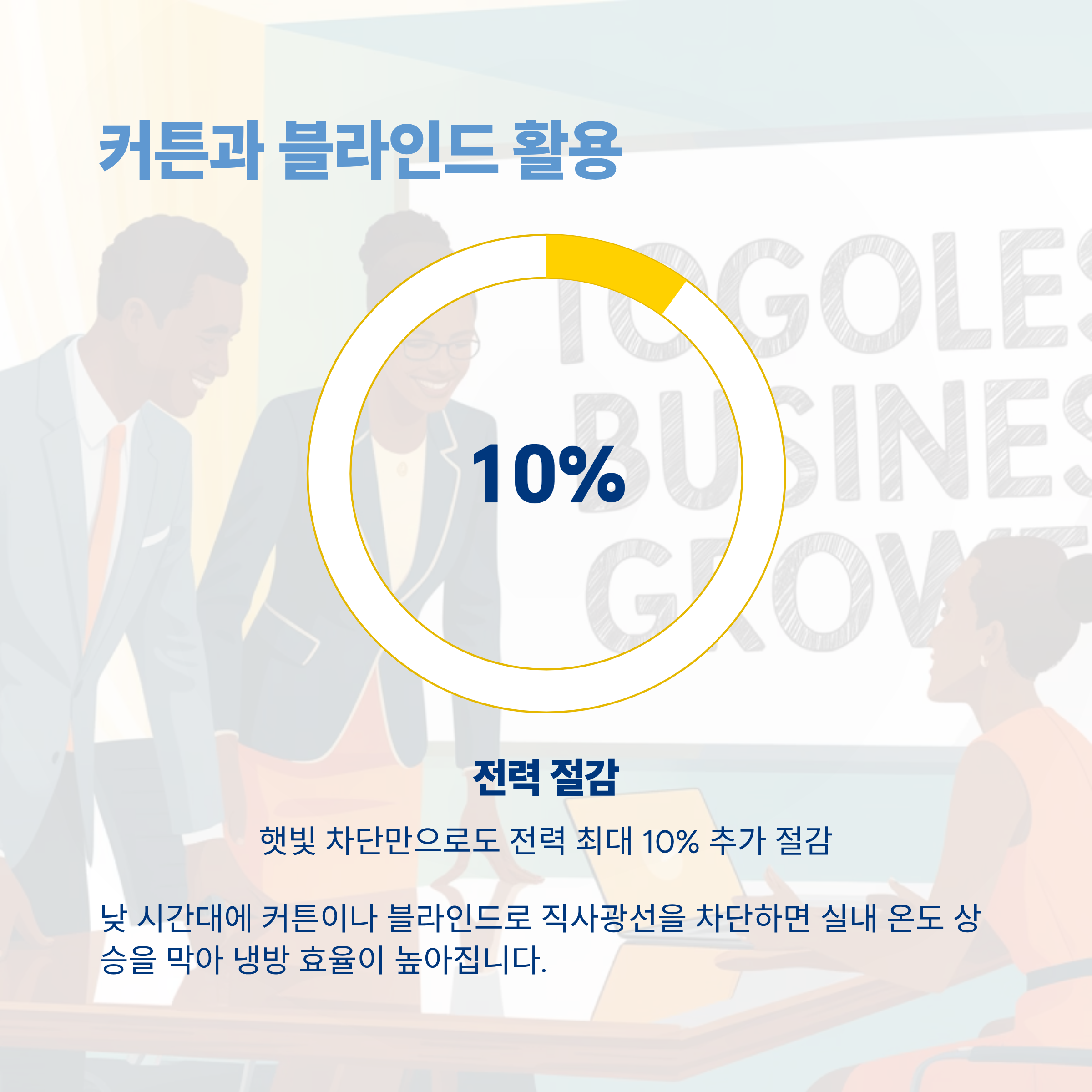 햇빛 차단만으로도 전력을 최대 10% 추가 절감할 수 있습니다. 낮 시간대에 커튼이나 블라인드로 직사광선을 차단하는 것만으로도 상당한 효과를 볼 수 있죠.