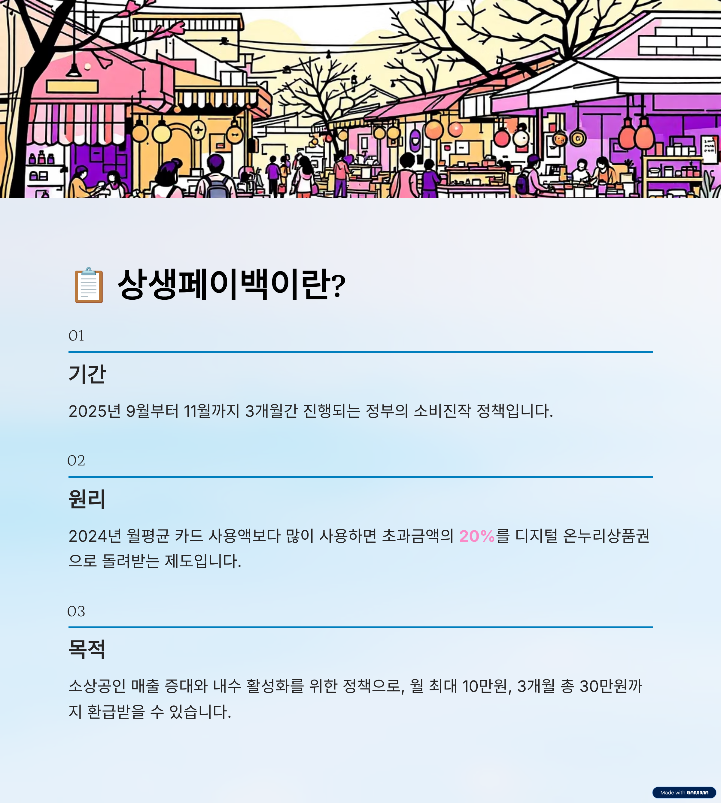 상생페이백은 2025년 9월부터 11월까지 3개월간 진행되는 정부의 소비진작 정책입니다. 간단히 설명하면, 2024년 월평균 카드 사용액보다 많이 사용하면 초과금액의 20%를 디지털 온누리상품권으로 돌려받는 제도입니다.