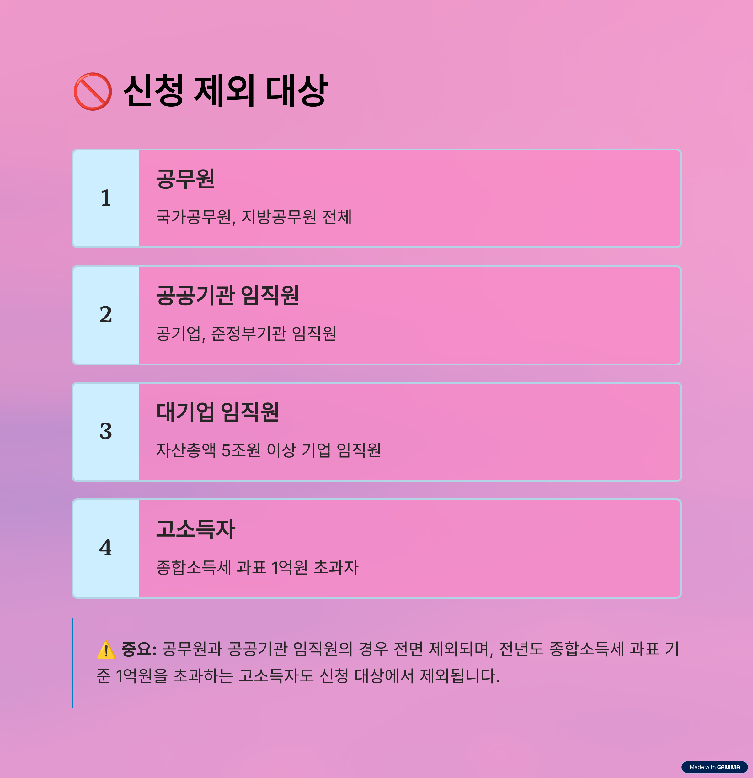 공무원과 공공기관 임직원의 경우 전면 제외되는 점을 주의하셔야 합니다. 또한 전년도 종합소득세 과표 기준 1억원을 초과하는 고소득자도 신청 대상에서 제외됩니다.