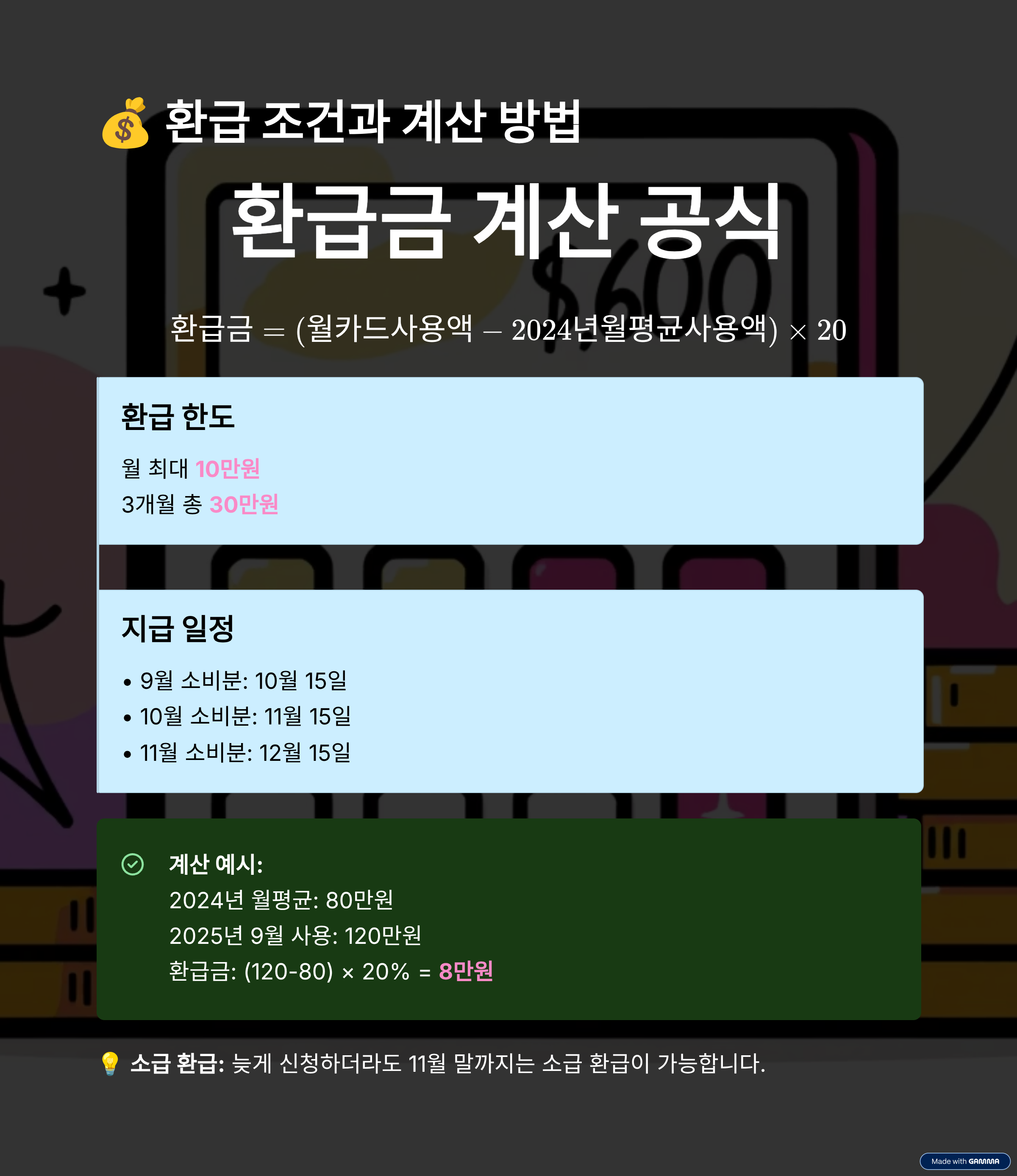 환급금 = (월 카드 사용액 - 2024년 월평균 사용액) × 20%