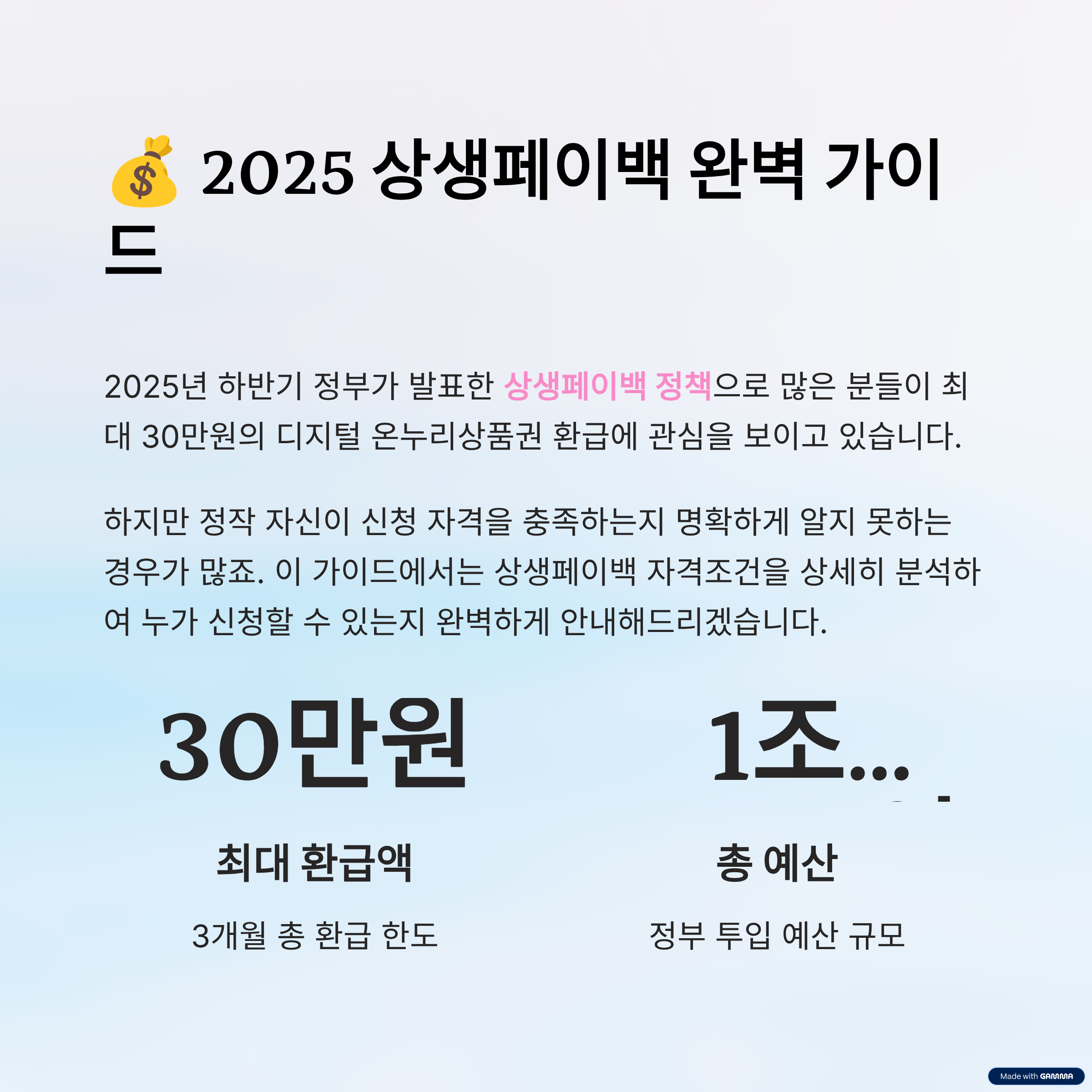 2025년 하반기 정부가 발표한 상생페이백 정책으로 많은 분들이 최대 30만원의 디지털 온누리상품권 환급에 관심을 보이고 있습니다. 하지만 정작 자신이 신청 자격을 충족하는지 명확하게 알지 못하는 경우가 많죠. 이 글에서는 상생페이백 자격조건을 상세히 분석하여 누가 신청할 수 있는지 완벽하게 안내해드리겠습니다.