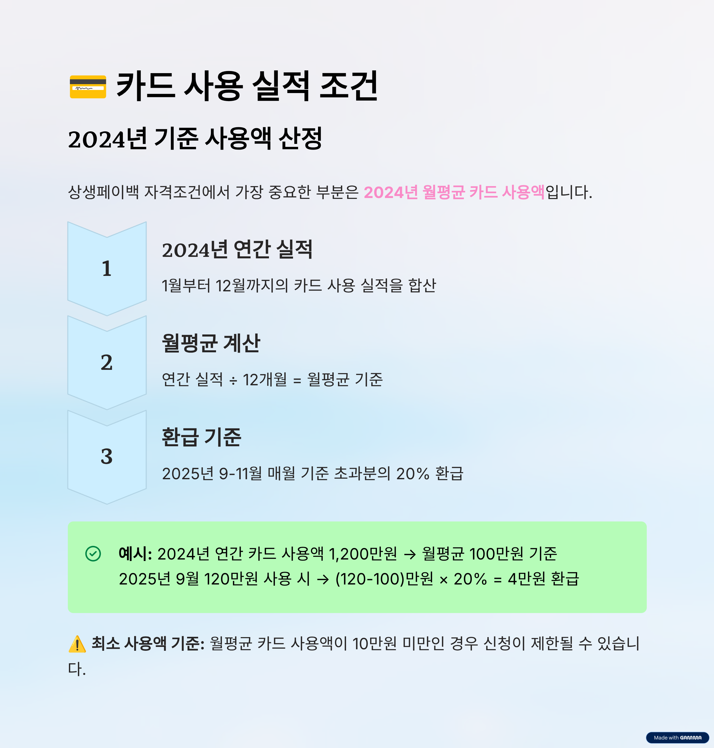 상생페이백 자격조건에서 가장 중요한 부분은 2024년 월평균 카드 사용액입니다. 2024년 1월부터 12월까지의 카드 사용 실적을 월평균으로 계산하여 기준점으로 삼습니다.
