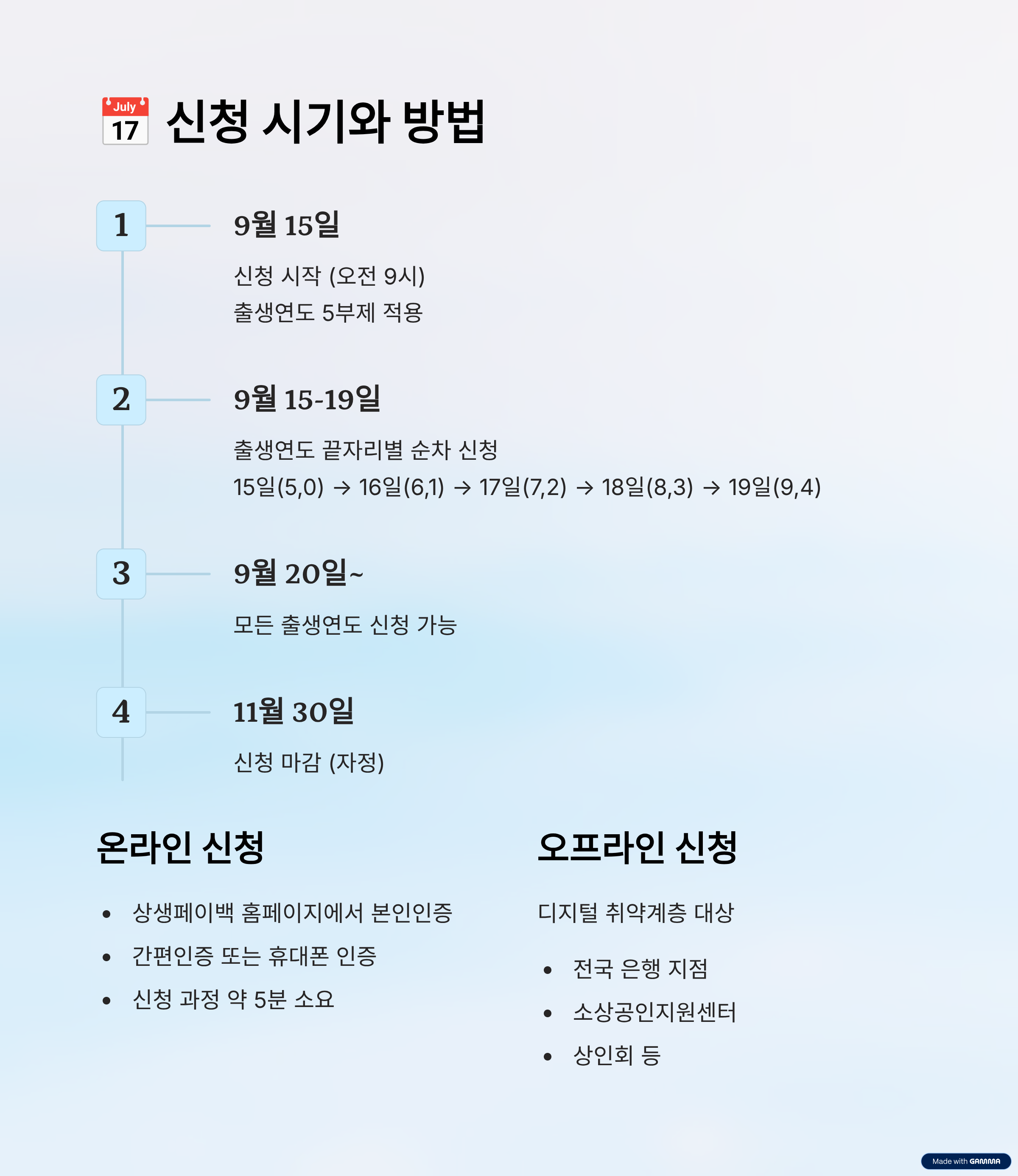 9월 15일(5,0), 16일(6,1), 17일(7,2), 18일(8,3), 19일(9,4) 순으로 신청이 시작되며, 9월 20일부터는 모든 출생연도가 신청 가능합니다.
