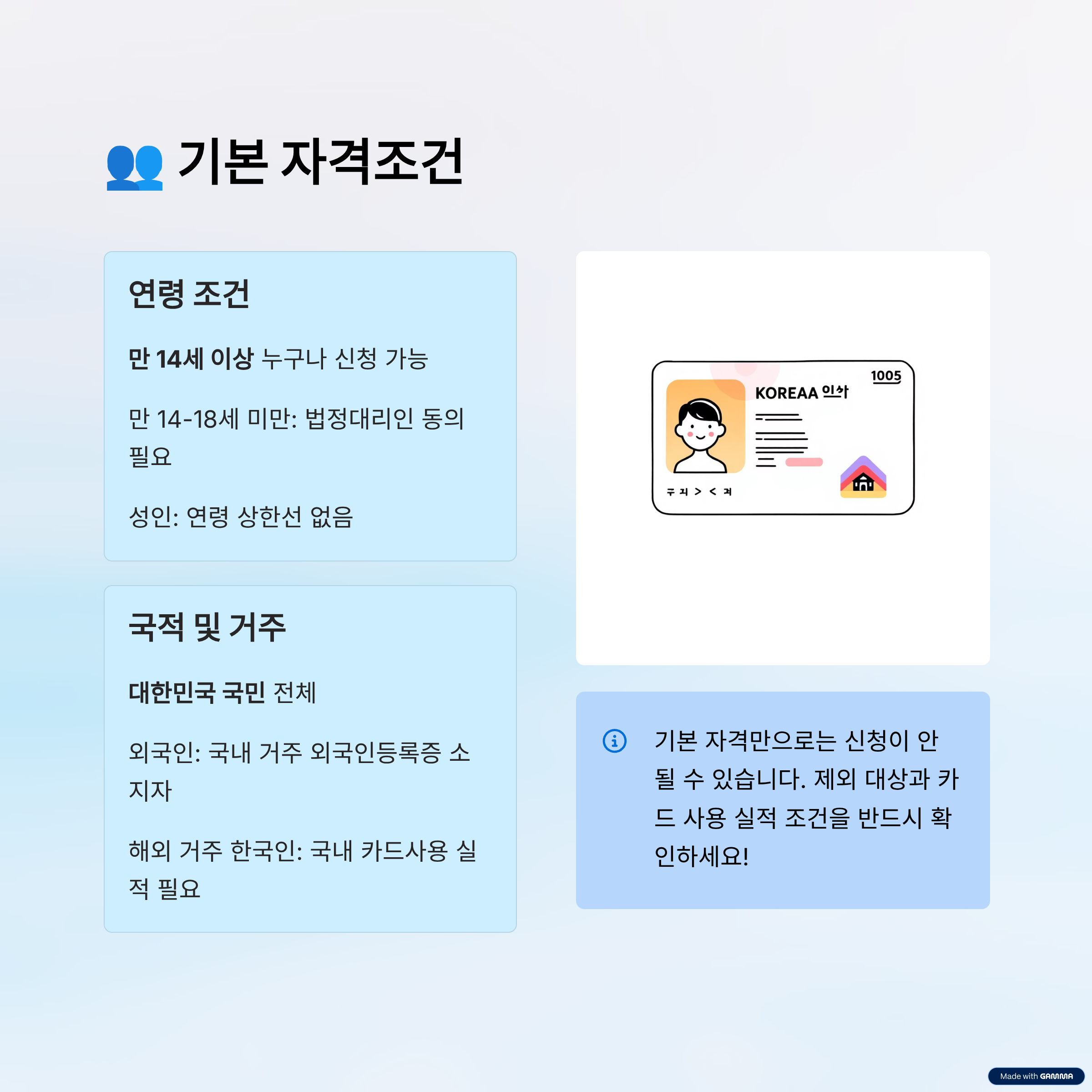 대한민국 국민이면 누구나 신청할 수 있습니다. 외국인의 경우 국내 거주하는 외국인등록증 소지자에 한해 신청이 가능합니다. 해외 거주 한국인의 경우 국내 카드사용 실적이 있어야 신청할 수 있습니다.