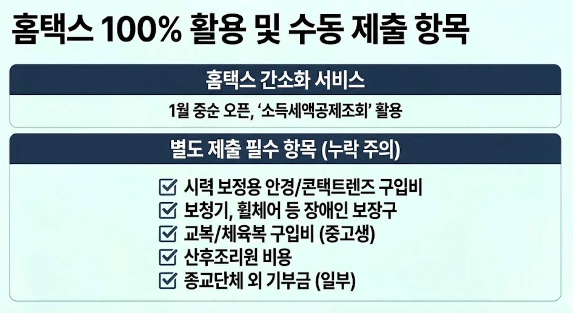 연말정산을 성공적으로 마무리하려면 1월 홈택스 간소화 서비스 개통 전에 미리 준비해야 합니다. 현금 영수증을 발급받지 못한 항목이나 간소화 자료에 누락될 가능성이 있는 안경 구입비, 산후조리원 비용, 교복 구입비 등의 영수증을 미리 챙겨두는 것이 좋습니다. 부양가족 공제를 받을 가족의 소득 요건을 확인하고 IRP 납입을 연말까지 완료하여 세액공제 한도를 최대한 활용해야 합니다.