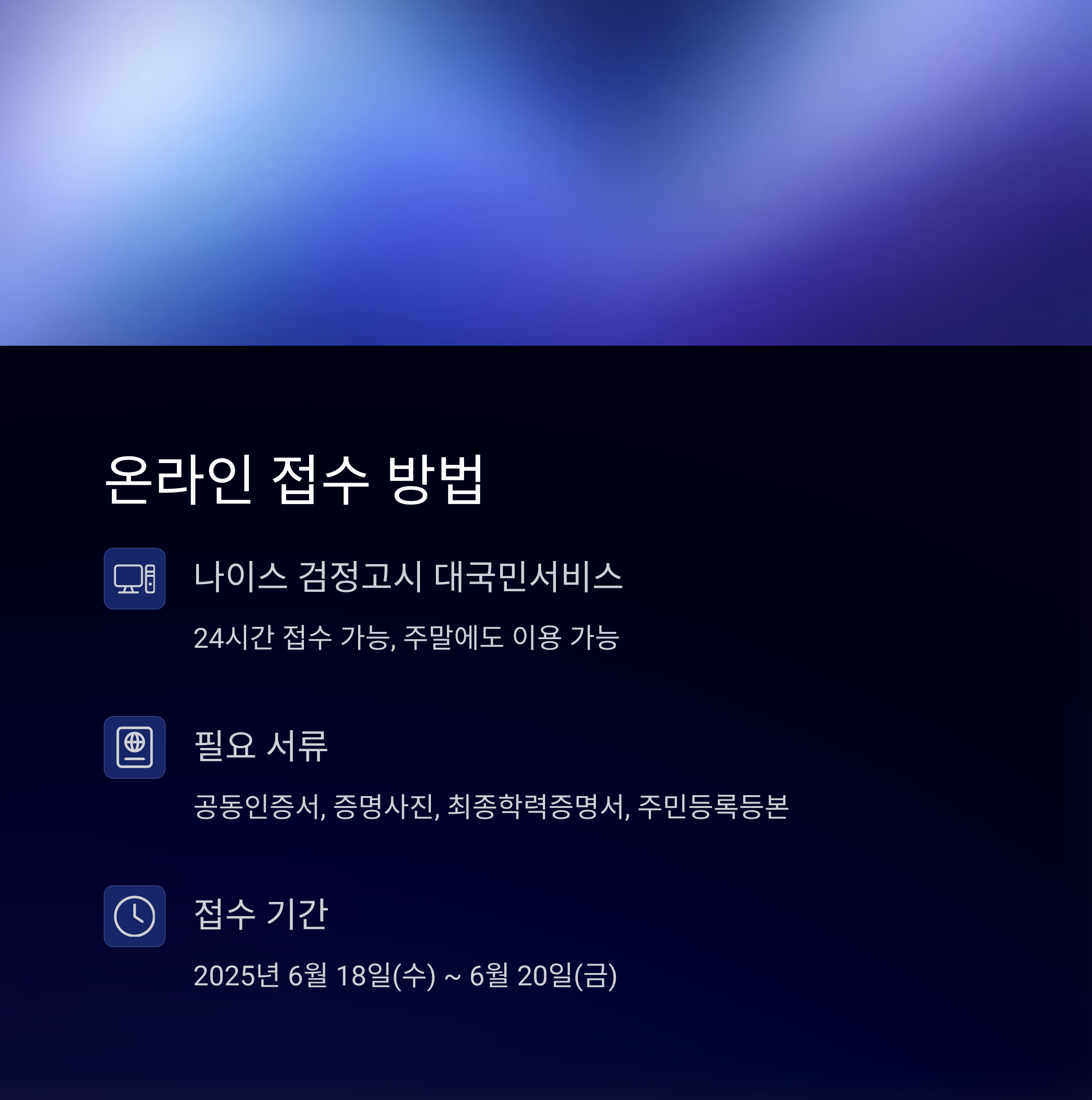 - 고졸 검정고시: 중학교 졸업자 또는 그에 준하는 학력 소지자